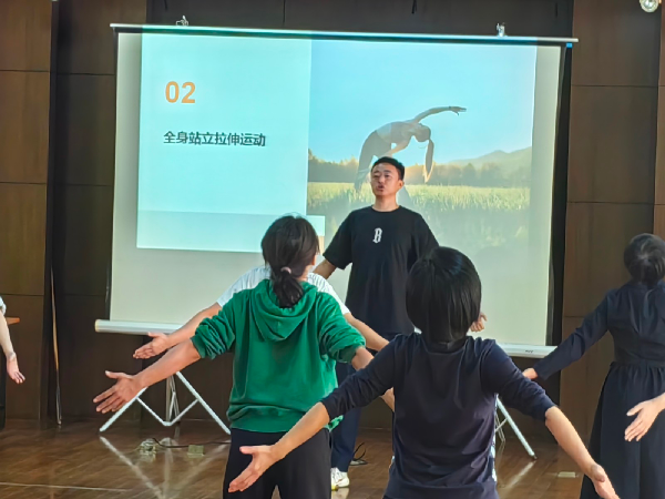 首先,王老师科普了运动前后热身和放松的必要性和重要性。热身运动对于预防运动损伤、提高运动表现、增加身体柔韧性和准备身心状态非常重要。无论进行什么类型的运动,运动前的拉伸可以迅速热身且增强健身功效。运动后的科学有效的合理放松运动可以帮助身体迅速恢复,减少运动后不适感,更是运动过程中不可忽视的部分。随后,王老师带领大家现场练习了几组无器械全身站立拉伸和放松动作。