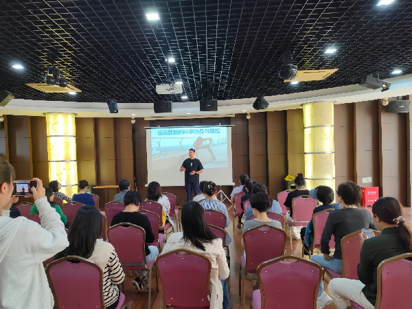 值校工会开展“喜迎校庆教职工社团活动月”系列活动之际,2023年10月18日下午,健康保健社邀请会计学院王玉意老师在文翔路校区校工会多功能厅举行了主题为“运动前后的科学热身与放松”的分享活动。王玉意老师本科和研究生所学专业都是体育教育训练学,他为现场近30位老师作了专业讲解和示范。