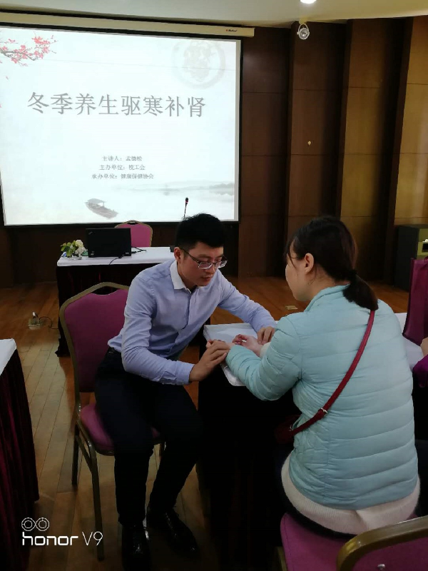 孟医生是位经验丰富的中医,擅长面诊、舌诊、手诊,针对冬季养生普遍存在的健康问题介绍了行之有效的医疗保健方法和适宜冬令时节的食补清单,讲座后一一为老师们把脉问诊、推拿问诊,进行病理诊断,回答健康咨询。通过讲座,大家不仅学习了中医养生健康知识,更进一步增强了日常自我保健意识。