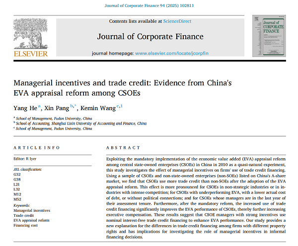 我院庞欣老师以通讯作者身份与合作者撰写的论文“Managerial incentives and trade credit: Evidence from China's EVA appraisal reform among CSOEs”在Journal of Corporate Finance期刊线上正式发表。Journal of Corporate FinanceABS-4星级期刊和SSCI一区期刊,最新影响因子为7.2,是金融学和财务学领域的国际权威期刊。