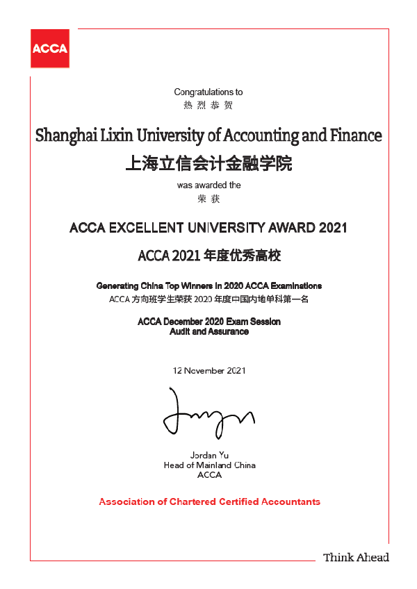 2021年11月12日,由ACCA(特许公认会计师公会)主办的“第十二届ACCA全国高校教育峰会——“数智化下的教育改革”暨“优秀院校奖项”颁奖活动在线上举办。本次会议对全国各地在ACCA人才培养中取得优异成绩的高校作出了表彰,中国区共有9所高校荣获ACCA年度优秀高校,我校继2017、2018、2020年获“ACCA年度优秀高校”荣誉称号之后,再次获此殊荣。上海立信会计金融学院会计学院邵军院长在线参加了峰会并领取优秀高校奖项。