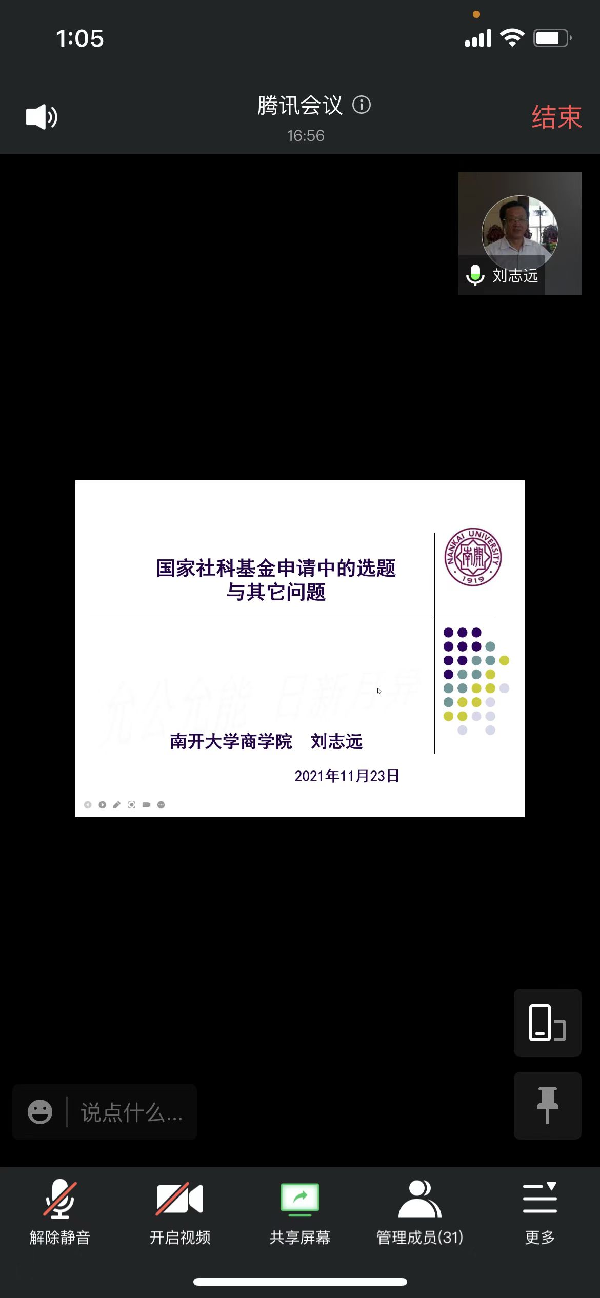 2021年11月23日下午会计学院在腾讯会议举办题为“2022年国家社科基金项目选题辅导”学术交流,选题辅导由南开大学商学院刘志远教授主讲,邵军院长主持,39名专业教师参加。