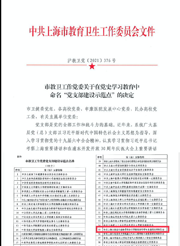 根据市委组织部关于在党史学习教育中命名一批“党支部建设示范点”工作部署,对标建设要求,会计学院财务管理专业教师党支部获市教卫工作党委“党支部建设示范点”。