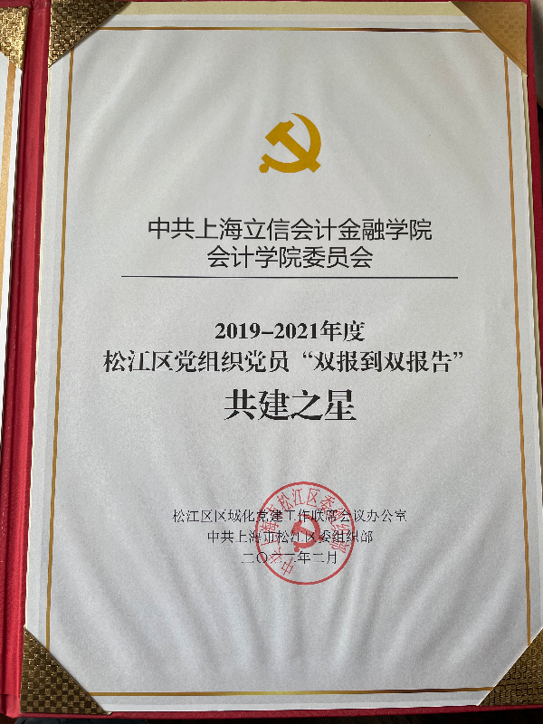 2月25日,松江区“新城率先发力、党建走在前头”区域化党建工作联席会议暨新城党建学习会在广富林遗址公园国际文化交流中心举行。会上命名了一批2019-2021年度区域化党建先锋单位,会计学院党委获松江区党组织党员“双报到、双报告”共建之星荣誉称号。