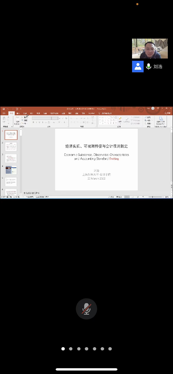 2022年3月23日下午会计学院在腾讯会议平台举办题为“经济实质、可观测特征与会计准则制定”学术讲座,讲座由上海财经大学会计学院刘浩教授主讲。刘浩,上海财经大学会计学院教授,博士生导师。主要研究领域为会计理论、公司治理,研究成果发表在《经济研究》、《管理世界》、《会计研究》等学术期刊,研究成果曾多次荣获中国会计学会年度优秀论文奖等。现兼任第三届财政部企业会计准则咨询委员会委员(曾任第一、二届),入选财政部全国会计领军人才(学术类第三期)。讲座由万华林教授主持,专业教师和学生共57人参加。