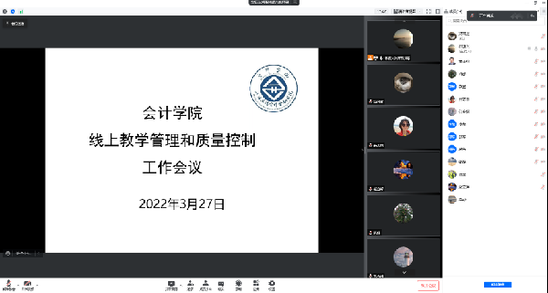 为了应对严峻疫情形势,持续提高线上教学质量,保障线上教学工作有序进行,有效落实各项教学任务,强化课堂纪律,确保线上教学和线下教学同质等效,会计学院于3月27日召开线上教学管理和质量控制会议,学院领导、各专业主任和教学督导参加会议,会议由教学副院长林振兴主持。