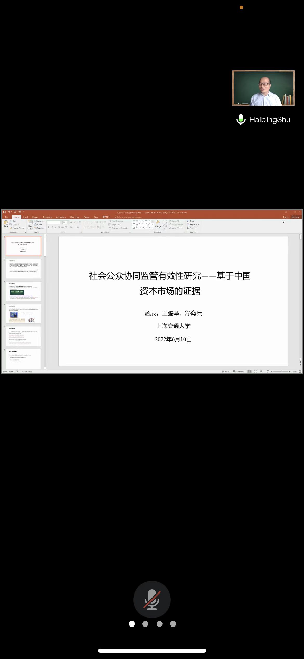 2022年6月10日下午2:30,会计学院在腾讯会议平台举办题为“社会公众协同监管有效性研究——基于中国资本市场的证据”学术讲座,讲座由上海交通大学舒海兵副教授主讲,万华林教授主持,专业教师和学生共28人参加。舒海兵,上海交通大学金融学副教授,金融工程博士,毕业于中国科学技术大学,弗吉尼亚大学达顿商学院联合培养博士、博士后。舒海兵副教授的学术研究主要集中在实证公司金融、公司治理和企业家创业领域,研究成果已发表在Review of Financial Studies、Journal of Financial Economics、Journal of Management Studies等学术期刊。