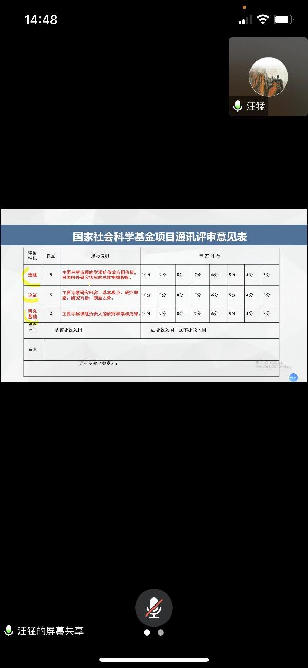 在1个多小时的分享交流中,汪猛副教授和吕明洁博士分别从国家社会科学基金项目申报书的主要内容,介绍了选题依据、研究内容、思路方法、创新之处、预期成果、研究基础和参考文献的填写具体要求,分享了相关注意事项。两位老师还结合自身的申报体会,强调了申请过程中特别需要关注的细节。