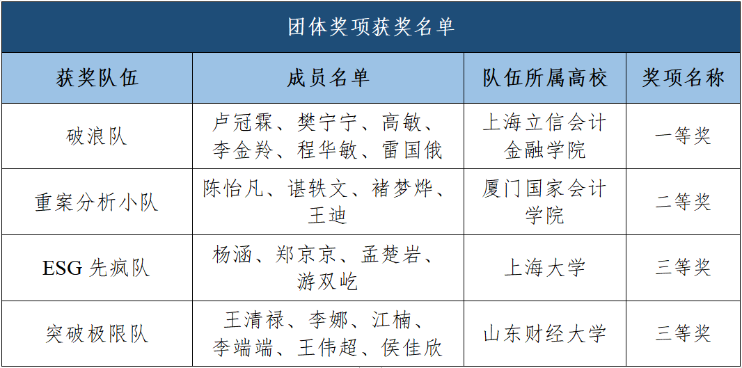 经过校内赛、初赛和复赛的层层筛选,来自上海大学的“ESG先疯队”以及来自山东财经大学的“突破极限队”获得大赛三等奖,来自厦门国家会计学院的“重案分析小队”与来自我校的“破浪队”挺进决赛进行一等奖的角逐。在本次决赛中,两支队伍都展现出优秀的专业素养和灵活的答辩能力,赢得在场评委的一致好评。