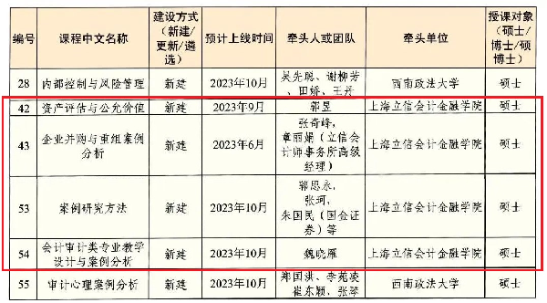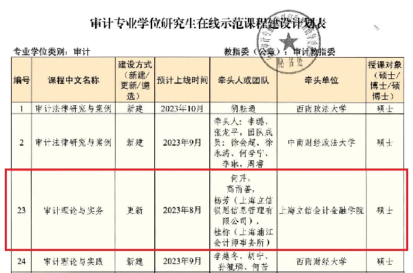 根据学位办【2022】22号《关于开展专业学位研究生在线示范课程建设工作的通知》文件要求,全国审计专业学位研究生教育指导委员会(简称审计教指委)于2022年12月至2023年2月启动专业学位研究生在线示范课程遴选工作。经审计教指委秘书处组织专家评审,教指委审议通过并报送国务院学位办,我校会计学院《审计理论与实务》等5门研究生课程成功入选全国教指委首批专业学位研究生在线示范课程建设计划。