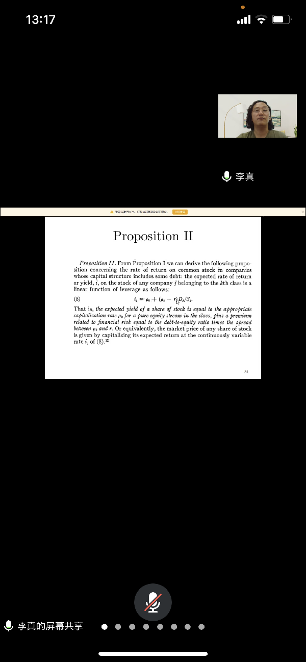 李真教授,上海立信会计金融学院教授、工商管理学科带头人,研究成果发表在《The Accounting Review》《Journal of Accounting and Economics》《Journal of Accounting Research》《Contemporary Accounting Research》《Review of Accounting Studies》《Journal of Finance》《Journal of Financial Economics》《Journal of Financial and Quantitative Analysis》等国际顶级学术期刊。在为期两小时的讲座过程中,李教授对资本市场的税务研究的关键问题进行了梳理和回顾,资本市场的税务研究主要包括了股利、资本结构、资本利得税、除息日等领域。在本次讲座中,李教授主要回顾了资本结构的税务研究问题。从经典的MM理论中的资本结构无关论出发,企业的价值与资本结构无关。当引入了公司税,利息的抵税作用可以增加企业价值,因此企业应该增加债务比例。进一步引入个人层面的税以及不同税种的税率差异后,企业在理论上有一个最优的资本结构,从而体现了税对企业资本结构和企业价值的影响。李教授对该领域的经典文献做出了回顾和点评,并讨论了现有研究所面临的挑战。接下来,李教授将视角转向税收关系中的政府,并讨论了政府的税收政策对企业投资行为,避税行为和股票交易的影响。
