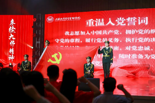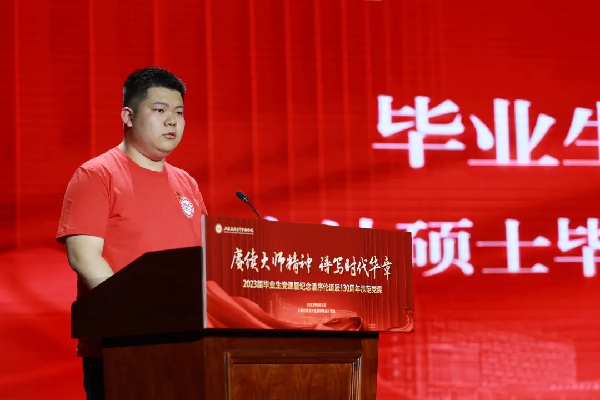 毕业生党课上,全体师生党员面向党旗,重温了入党誓词。充满仪式感的宣誓既是对初心使命的回望,也是对接续奋斗的宣誓。上海高校百名学生党员标兵获得者,2023届审计硕士毕业生党员饶正奇同学作为代表发言。