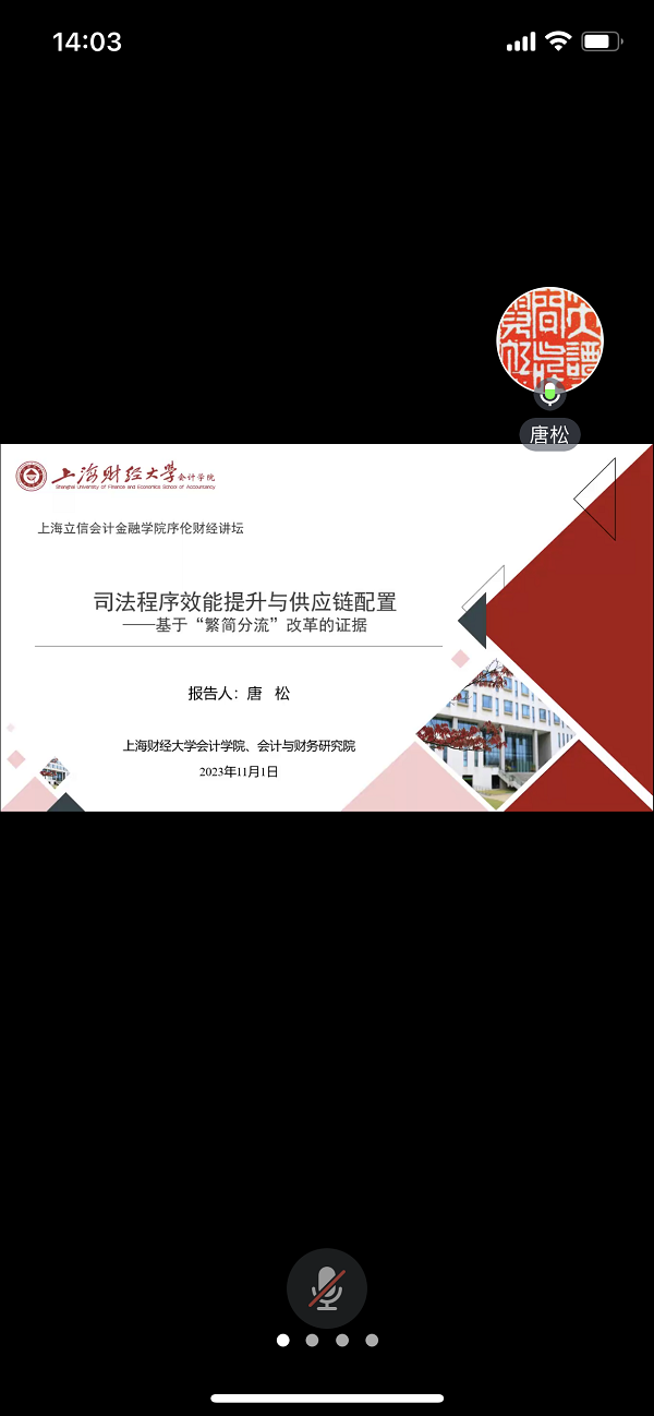 2023年11月1日下午,会计学院邀请上海财经大学唐松教授在文翔路校区序伦大楼806会议室和腾讯会议平台举办题为“司法程序效能提升与供应链配置——基于‘繁简分流’改革的证据”学术讲座,讲座由会计学院副院长林振兴主持,来自我校、上海财经大学、上海大学、浙江财经大学、兰州大学、杭州师范大学等高校共41名师生参加。