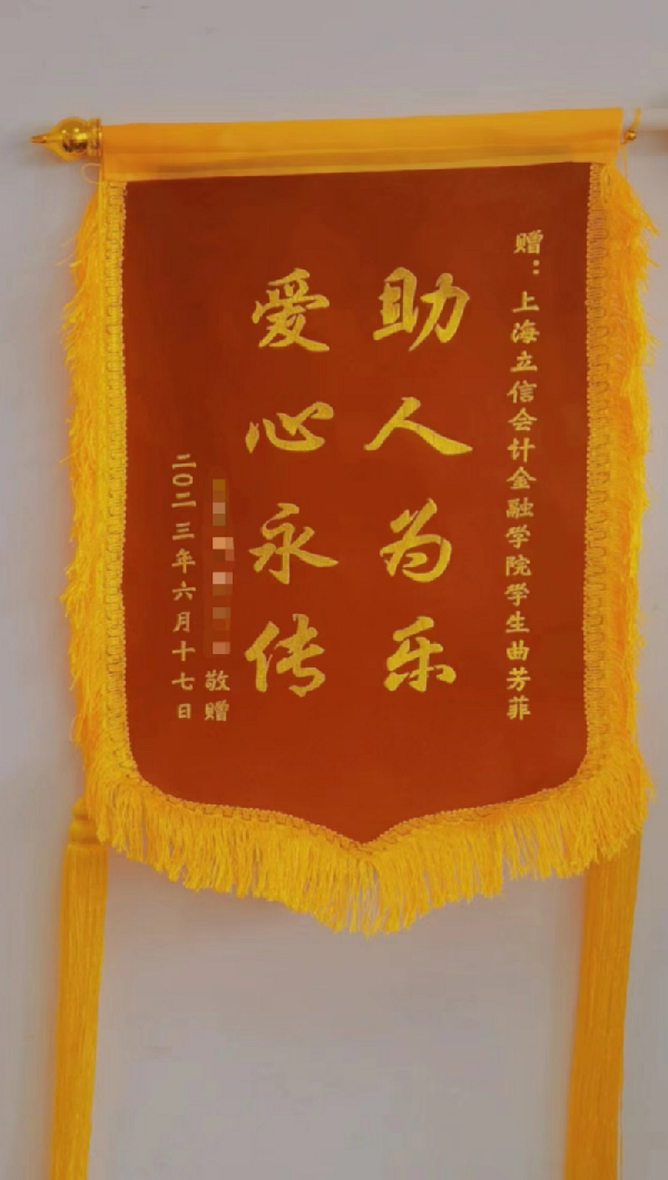 近日,会计学院收到了一面“助人为乐,爱心永传”的锦旗和感谢信,对我院会计学专业曲芳菲同学助人为乐的善举表达了衷心的感谢。