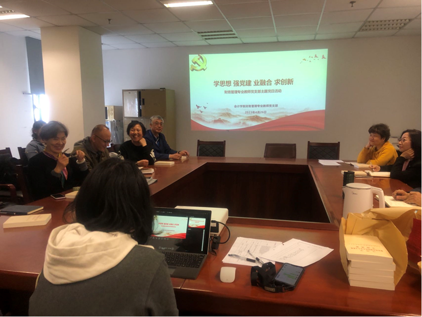 4月26日下午,会计学院财务管理专业教师党支部开展“学思想 强党建 业融合 求创新”校级观摩主题党日活动。活动由支部书记王瑞主持,会计学院行政党支部书记周华,财务管理专业主任巩娜及支部全体党员和非党员教师代表参加。