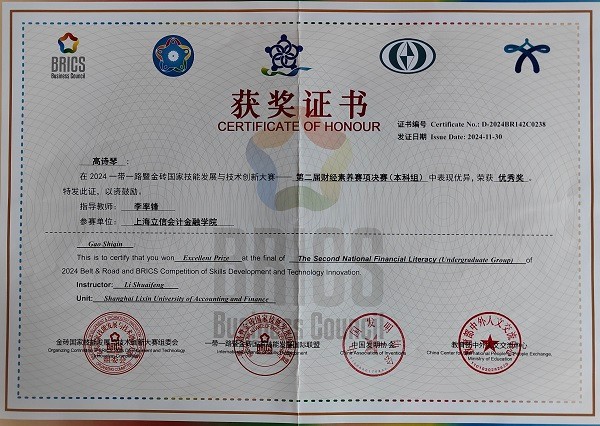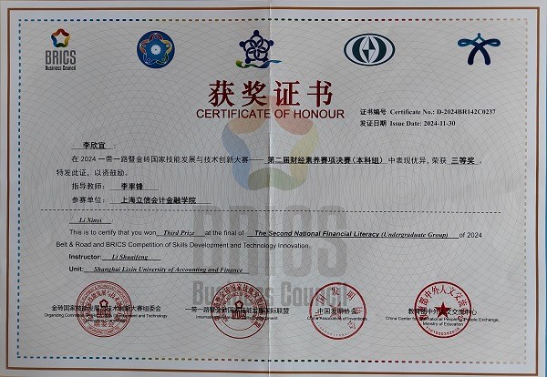11月24日,“2024一带一路暨金砖国家技能发展与技术创新大赛之第二届财经素养赛项决赛(本科组)”决赛成功举办(线上),来自国内上海财经大学、南京审计大学、上海立信会计金融学院等197所本科院校的373名选手参加了比赛。经过激烈角逐,由我院李率锋老师担任指导教师、何亚南老师担任领队的2023级审计学专业同学李欣宜、高诗琴分获大赛(国内组)三等奖、优秀奖。