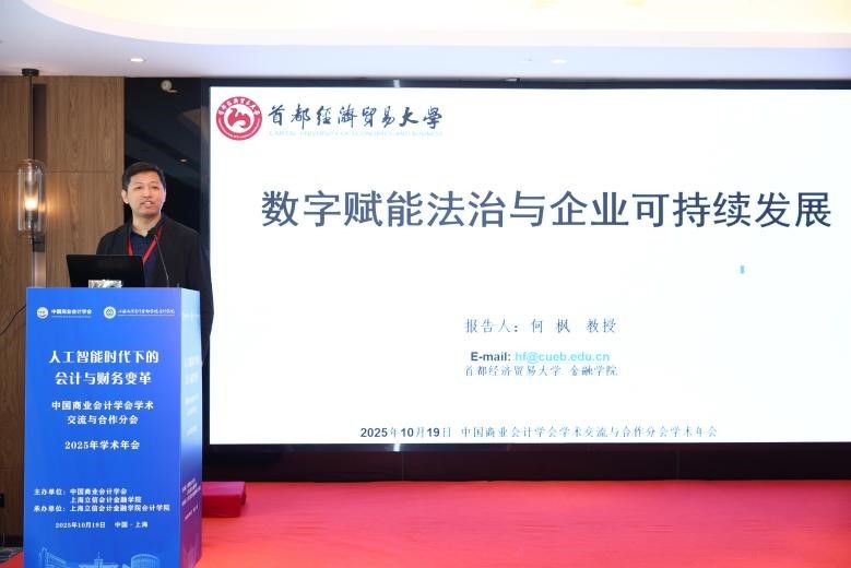 首都经济贸易大学科研处副处长何枫教授以“数字赋能法治与企业可持续发展”为题,聚焦智慧法院建设这一制度创新实践。他指出,智慧法院通过提升司法效率、强化诉讼约束,倒逼企业提升ESG表现,构建了“数字法治—风险约束—社会责任”的传导机制。该研究将数字技术、法治建设与企业可持续发展有机衔接,为国家制度创新、数字化建设与企业高质量发展提供了新的理论解释与实践路径,彰显了学术研究服务国家战略的时代价值。