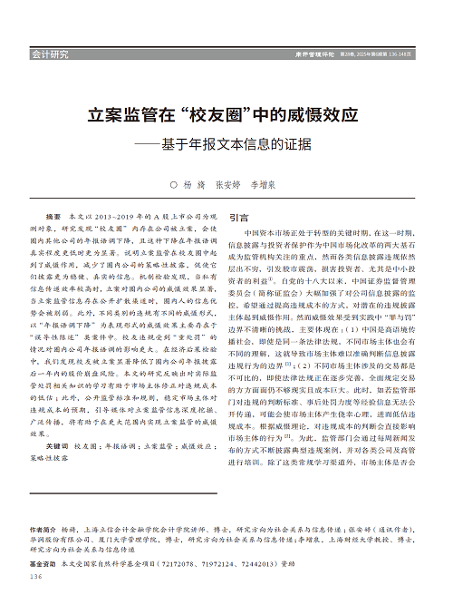 本文以20132019年的A股上市公司为观测对象,研究发现“校友圈”内存在公司被立案,会使圈内其他公司的年报语调下降,且这种下降在年报语调真实程度更低时更为显著。说明立案监管在校友圈中起到了威慑作用,减少了圈内公司的策略性披露,促使它们披露更为稳健、真实的信息。机制检验发现,当私有信息传递效率较高时,立案对圈内公司的威慑效果显著,当立案监管信息存在公开扩散渠道时,圈内人的信息优势会被削弱。此外,不同类别的违规有不同的威慑形式,以“年报语调下降”为表现形式的威慑效果主要存在于“误导性陈述”类案件中。校友违规受到“重处罚”的情况对圈内公司年报语调的影响更大。在经济后果检验中,我们发现校友被立案显著降低了圈内公司年报披露后一年内的股价崩盘风险。本文的研究反映出对实际监管处罚相关知识的学习有助于市场主体修正对违规成本的低估;此外,公开监管标准和规则,稳定市场主体对违规成本的预期,引导媒体对立案监管信息深度挖掘、广泛传播,将有助于在更大范围内实现立案监管的威慑效果。