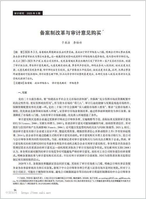 2020年3月,备案制改革随新证券法同步实施,其放松了审计市场准入门槛,明确会计师从事证券服务业务由事前审批改为事后双备案。这一制度将深刻影响我国审计市场结构与竞争格局,进而影响审计师行为。本文以2015-2023年沪深A股公司为样本,发现备案制改革在短期内引发了审计师-客户关系的不匹配,削弱了审计独立性,带来审计意见购买。从意见购买动机看,事务所声誉较低、师均业务收入较低时,该效应更为显著;从意见购买实现条件看,审计师行业专长较低、客户重要性水平较高时,该效应更为显著。此外,改革后事务所被替换的可能性增加、审计收费总额下降,但正向异常审计收费现象更突出,本研究为准入政策效果评估及监管优化提供了启示。