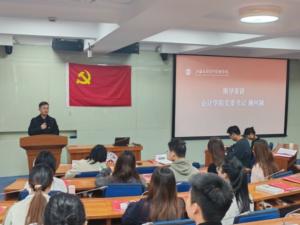 会计学院党委书记谢何融代表学院党委向新加入党组织的党员致以热烈祝贺。他指出,作为财经领域的生力军与新党员,一要筑牢理想信念,树立正确世界观、人生观和价值观;二要强立信之魂,做德才兼备的财经英才;三要练就过硬本领,做学验并重的实战先锋。