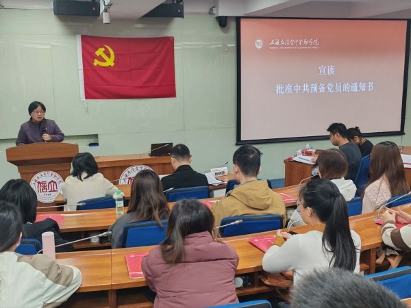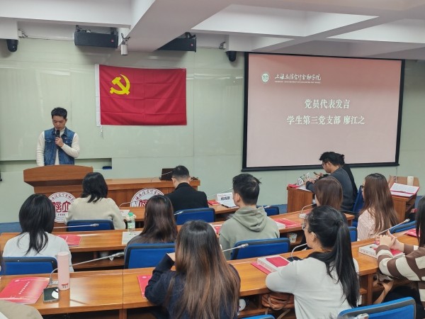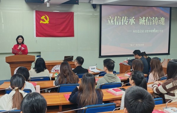 新发展党员退役大学生廖江之回顾了他在学校和部队三次递交入党申请书,经过培养考察,最终成为预备党员的成长历程,对党组织的培养、老师的教诲和同学的帮助表示诚挚谢意。会计学院“烽火”党史宣讲团以《立信传承诚信铸魂》为主题进行了宣讲,生动诠释诚信精神与党员信仰,引导新党员将立信优良传统融入血脉、践行于行。