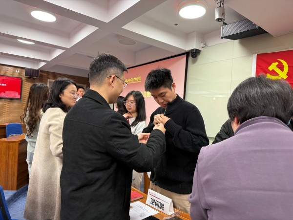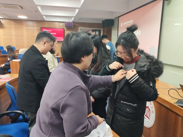 会计学院党委副书记、副院长杨晓丽宣读《批准中共预备党员的通知书》,学院领导和老师为新党员佩戴党员徽章。入党宣誓仪式由谢何融领誓。43位新党员举起右拳面向党旗庄严宣誓。铿锵誓言回荡会场,在庄严仪式中强化了党员的身份认同与责任担当。