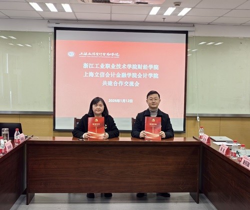 2026年1月12日下午,浙江工业职业技术学院财经学院来访会计学院,双方在序伦大楼806举办了党建共建暨产教融合专题交流会。浙江工业职业技术学院党委委员、纪委书记楼青青,财经学院党总支书记何娟、院长魏标文、党总支副书记李光明、学术副院长王珂等一行6人出席。会计学院党委书记谢何融,党委副书记、副院长杨晓丽,副院长(挂职)郭昱,浙江工业职业技术学院财经学院挂职会计学院产业学院副院长甘泉等出席。