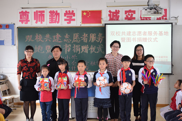 6月6日,会计学院与松江区北干山小学共建志愿者服务基地揭牌仪式暨图书体育器材捐赠仪式在北干山小学举行。参加此次活动的师生有:北干山小学校长徐平,会计学院党委副书记、副院长夏昱、团委书记张银爽、团学指导老师方爽;以及北干山小学学生代表和会计学院志愿者。