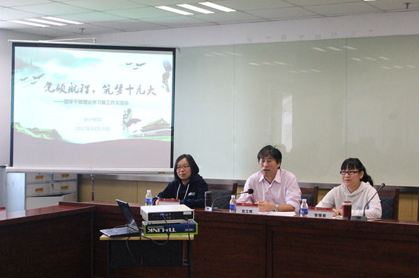 10月20日,会计学院在序伦大楼806室召开了“党领航程,筑梦十九大”团学干部理论学习暨工作交流会。出席本次会议的有会计学院党委书记赵立辉,团委书记张银爽,团学指导老师方爽及团学干部。