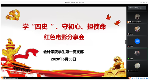 为更好地开展四史学习教育,引导学生党员强化历史思维、增强责任担当,5月30日下午,会计学院学生第一党支部全体师生通过腾讯会议平台,开展了“话电影,学四史”主题党日活动。