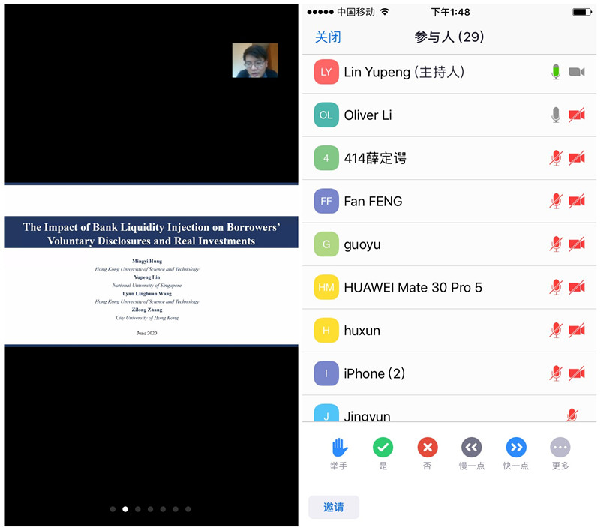 2020年6月24日下午会计学院在ZOOM会议平台举办题为“The Impact of Bank Liquidity Injections on Borrowers’ Voluntary Disclosures and Real Investments”学术讲座,讲座由李真教授主持,新加坡国立大学教授林宇鹏主讲,近30位专任教师参加。