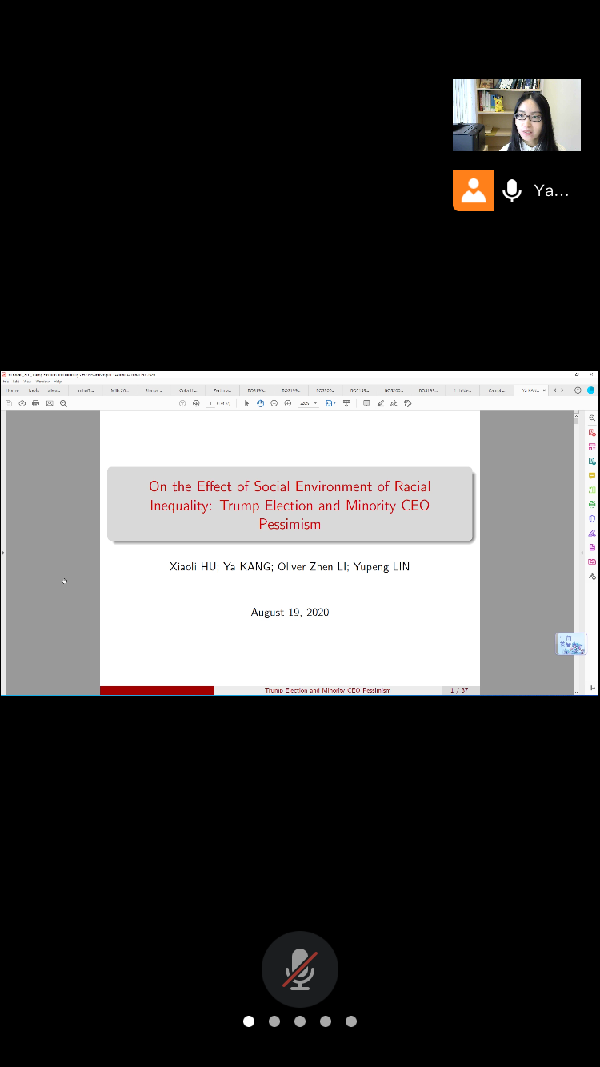 2020年8月19日下午会计学院在腾讯会议平台举办题为“On the Effect of Social Environment of Racial Inequality: Trump Election and Minority CEO Pessimism”学术讲座,讲座由香港中文大学会计系助理教授康亚主讲,李真教授等近20位专任教师参加。