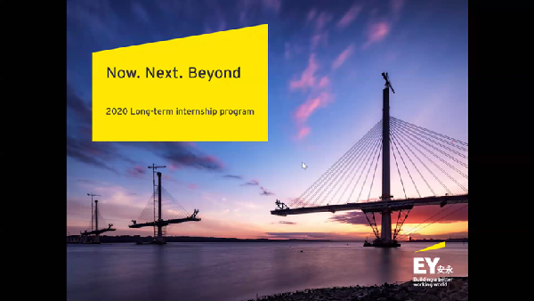 杨展老师从应届生进入职场的新人角度,为我们分享了加入安永带来的收获。从投递简历、面试经历到实习过程,杨展老师用生动有趣的语言,讲述在安永工作实习的心路历程,也谈到在安永实习的优势,不仅有因客户与企业建立的长期友好的合作关系带来的资源优势,也有个人职业导师,在每一个阶段为你答疑解惑。