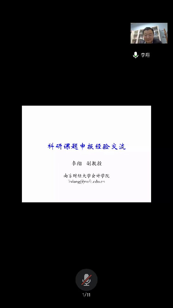 2020年11月27日下午会计学院在腾讯会议平台举办题为“财务与会计领域科研课题申报经验交流”的学术交流,讲座由南京财经大学副教授、入选财政部全国会计领军人才计划(2008)李翔主讲,张奇峰教授主持,专任教师和学生共42人参加。