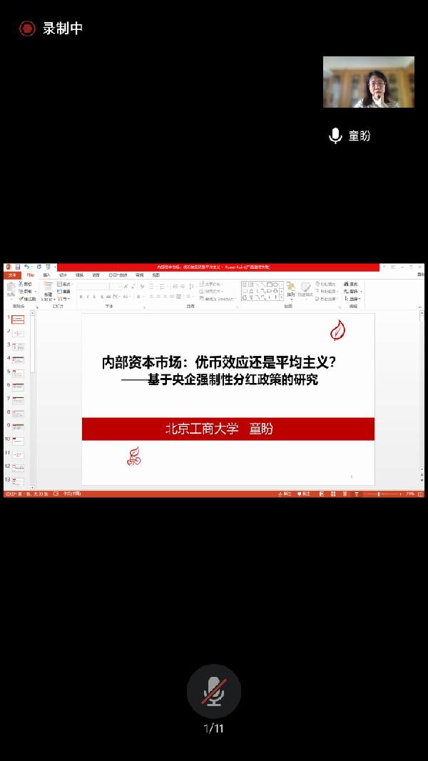 2020年12月4日下午会计学院在腾讯会议平台举办了学术交流,南京审计大学审计学池国华教授和北京工商大学商学院童盼教授分别交流了“国家自然科学基金项目申报的几点体会”和学术论文“内部资本市场:优币效应还是平均主义?——基于央企强制性分红政策的研究”。学术交流活动由会计学院张奇峰教授主持,专业教师和学生共34人参加。