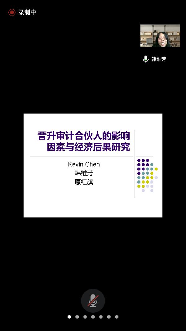 2020年12月18日下午会计学院在腾讯会议平台举办题为“晋升审计合伙人的影响因素与经济后果研究”讲座,讲座由上海财经大学韩维芳主讲。韩维芳博士,上海财经大学会计学院讲师,注册会计师非执业会员,上海市晨光学者,香港科技大学访问学者。主要研究方向为会计、审计与公司治理,教授《CPA审计》、《高级财务会计》、《财务会计》、《研究方法》等课程,主持国家自然科学基金青年项目、上海市晨光项目、上海市优青项目、立信会计产学研基地联合招标课题等,研究成果发表在审计研究、中国会计评论、审计与经济研究、会计与经济研究、中国注册会计师、Emerging Markets Finance and Trade等学术期刊上,获得2015年度、2016年度潘序伦中青年会计、审计优秀论文,连续多年获得上海市审计学会优秀论文。讲座由张奇峰教授主持,专业教师和学生共24人参加。