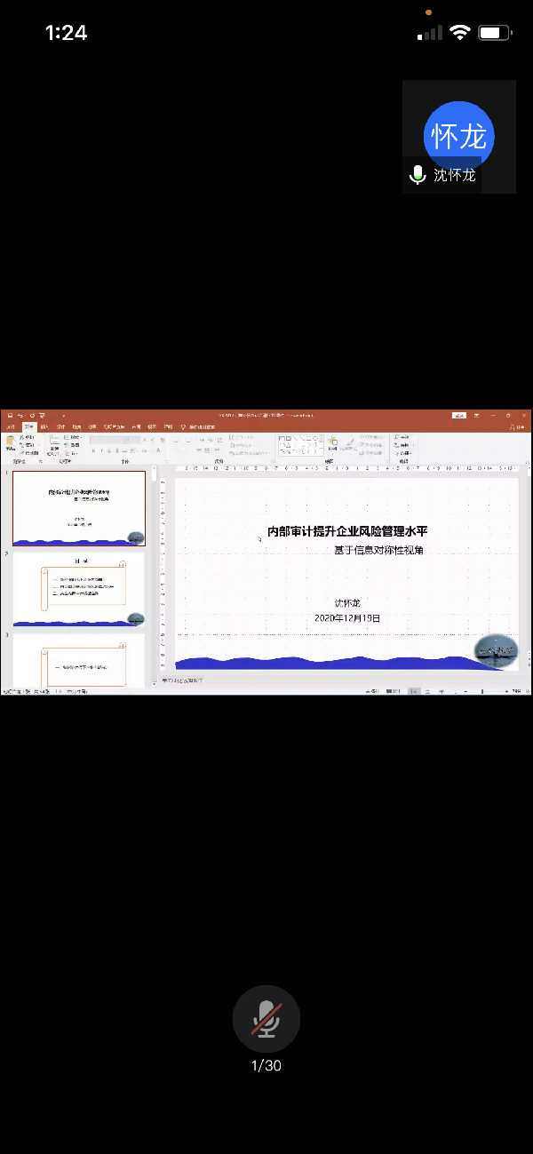 2020年12月19日下午会计学院在腾讯会议平台举办题为“内部审计提升企业风险管理水平——基于信息对称性视角”的学术讲座,讲座由上海松江城镇建设投资开发集团有限公司财务总监、董事沈怀龙主讲。沈怀龙总监已有20多年的从业经历,从财务基层工作做起,负责或分管过财务、审计、人力资源等多部门。参与过跨境并购,产业基金设立等资本运作,做过上市公司、大型国有企业集团财务、内部审计工作,在财务 管理、资本运营、内部控制、内部审计等方面有较丰富的从业经验。讲座由万华林教授主持,师生共97人参加。