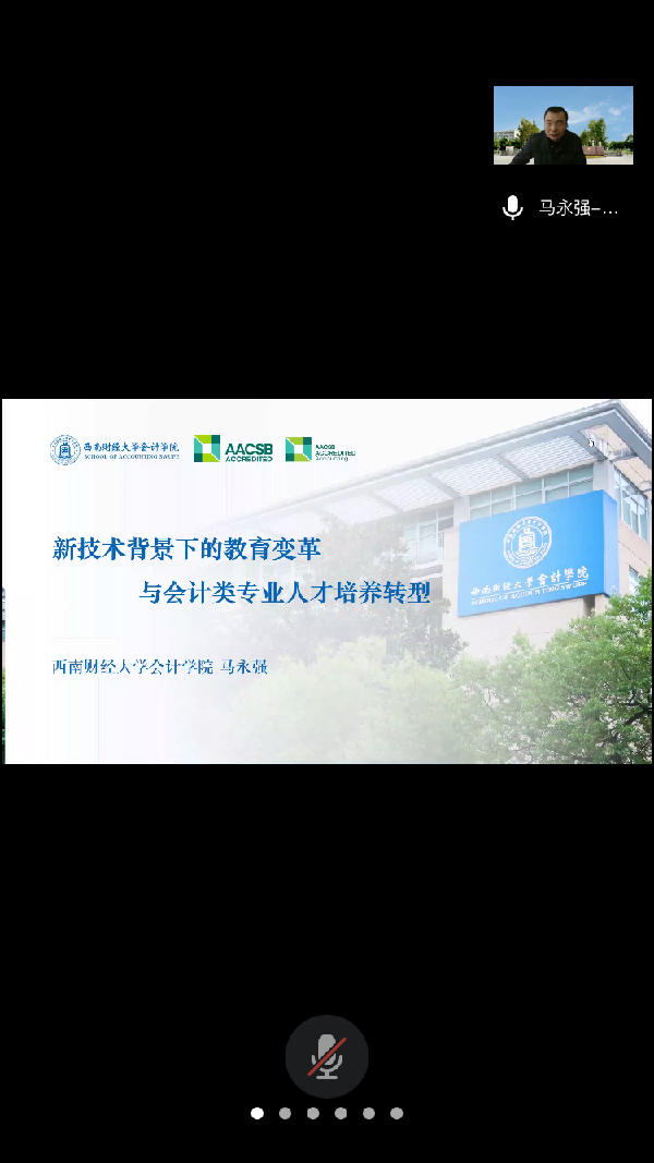 2021年1月13日下午会计学院在腾讯会议平台举办题为“新技术背景下的教育变革与会计类专业人才培养转型”学术讲座,讲座由西南财经大学会计学院院长、博士生导师马永强教授主讲。马永强,深圳证券交易所博士后、中国人民大学博士后、哥伦比亚大学高级访问学者。财政部全国会计名家培养工程入选者、教育部新世纪优秀人才支持计划入选者、财政部全国会计学术领军人才、教育部霍英东教育基金会高校青年教师奖获得者、四川省学术和技术带头人、四川省有突出贡献的优秀专家。中国管理现代化研究会青年工作委员会副主任、中国会计学会财务成本分会副会长、四川省会计学会副会长、四川省普通高校会计学专业教指委主任委员、四川省人大财经委咨询专家、深圳证券交易所博士后指导专家。国家自然科学基金项目评议人,《会计研究》、《金融研究》等杂志匿名审稿人。讲座由张奇峰教授主持,专业教师和学生共22人参加。