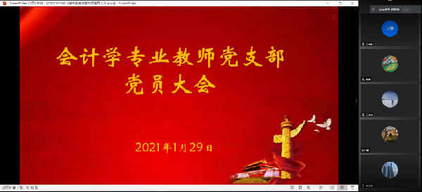 2021年1月29日,会计学专业教师党支部采用线上形式召开党员大会,会计学院党委书记赵立辉书记参会指导工作,会议由党支部书记邵丽丽主持,本支部全体教师党员参加。
